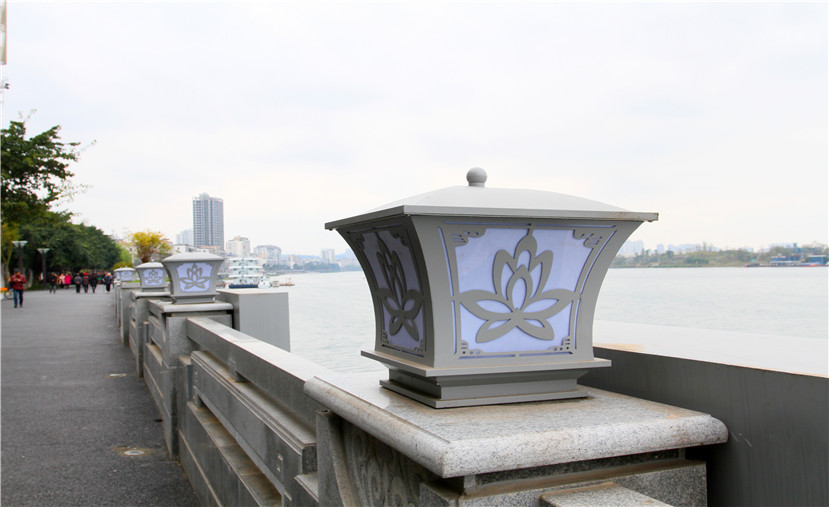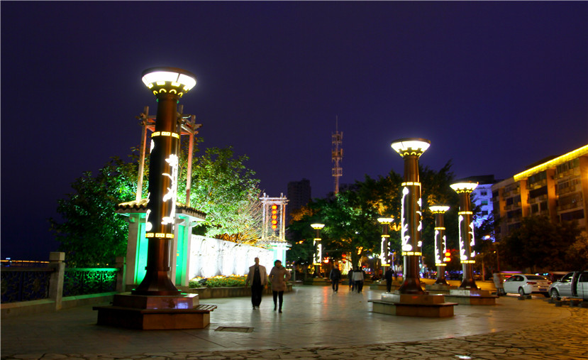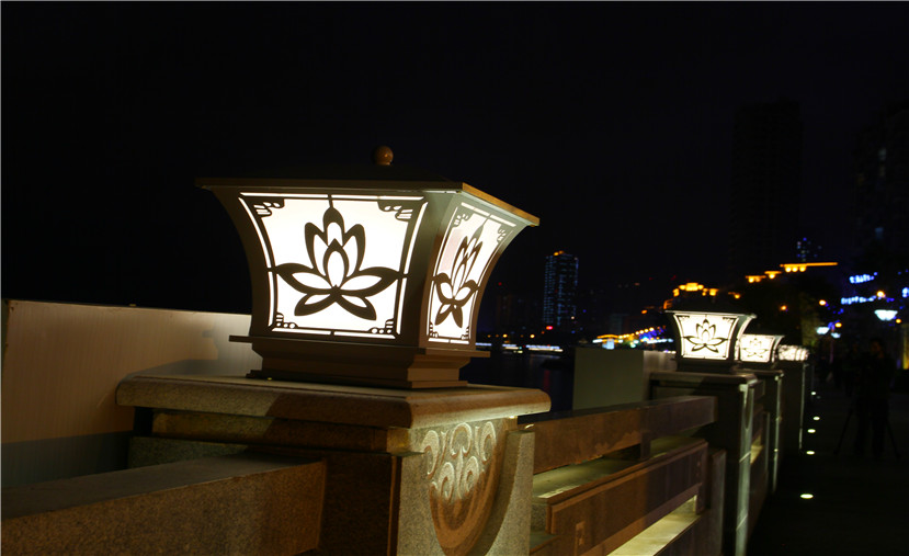 在重要的景觀廣場上,增加投影燈和廣場燈柱結(jié)合,并在設(shè)計(jì)中加入水紋蓮花古銅紋理和云石蓮花,在白天起到美化廣場的景觀效果,在夜景中又能展示不同的燈光效果,帶來富有特色的遂寧夜景。