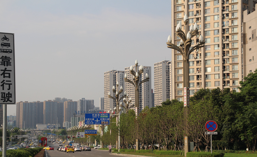 玉蘭燈,高15.08米,既有主光源,又有裝飾光源,皆采用LED,彰顯節(jié)能環(huán)保理念,既滿足了二郎迎賓大道和科成路路段的照明需求,同時也能起到裝飾美化城區(qū)面貌的作用。