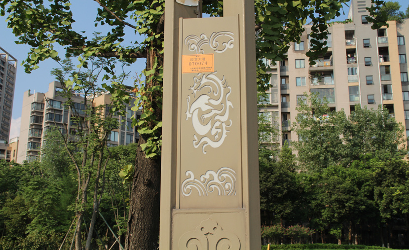 建立于春秋戰(zhàn)國時期的巴國以重慶為中心,創(chuàng)造了自己的文化,即巴文化,并且這種文化一直延續(xù)至今,成為連接古今巴文化的重要紐帶。設(shè)計者提取巴文化元素,在玉蘭燈底座采用巴文化花紋做浮雕。燈桿中部安裝兩個燈箱,上面的紋飾采用高新區(qū)和工業(yè)城的LOGO,并雕刻“高新九龍坡”和“百年工業(yè)城”的字樣紋飾。燈桿下部分雕刻龍紋紋飾,與地方方位名稱相得益彰,象征九龍坡。