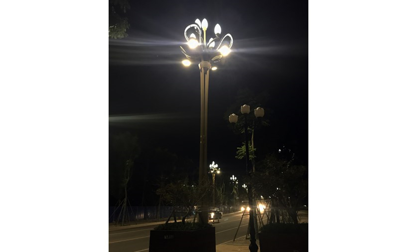 “梔子花開”景觀燈全采用LED光源,在保證道路照明亮度和照度的同時,節(jié)約了能耗,而乳白色的玻罩和夜晚潔白的燈光,與梔子花潔白的色彩和諧統(tǒng)一,猶如“梔子花開”。