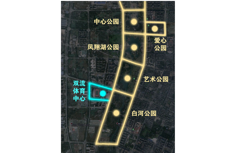 如果將金河路、銀河路兩面擁抱的五個公園比作串在一起的項(xiàng)鏈,那么雙流體育中心則像是鑲嵌在這串項(xiàng)鏈上一顆璀璨的珍珠。