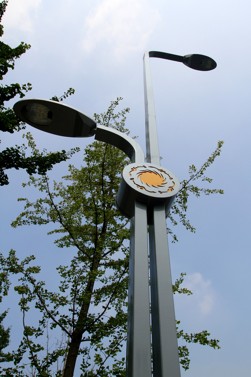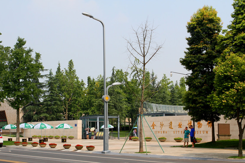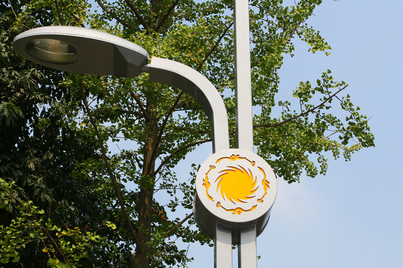 神暉,富有現(xiàn)代感,頗具特色。燈桿,使用具有文化色彩和現(xiàn)代感的顏色——灰色,在燈桿中段建立連接,加上成都獨有的內(nèi)透太陽神鳥鏤空圖案,蘊含了濃郁的地域文化。