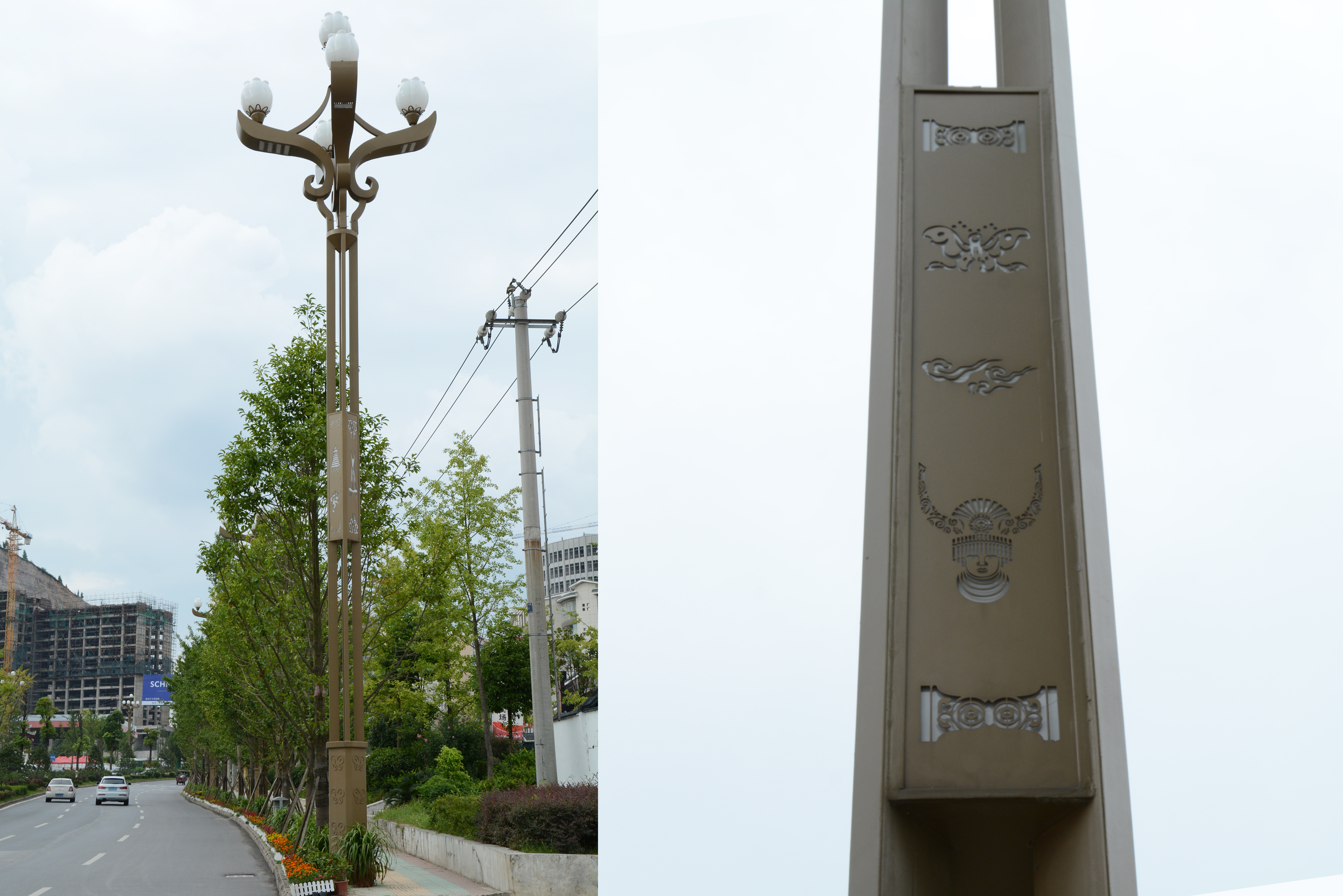 改造中使用的路燈,皆攫取了這一系列的元素,通過工業(yè)設(shè)計加工,形成了一盞盞頗具審美價值的道路燈,讓市民好不贊嘆。如玉蘭燈的燈桿上加入了吹蘆笙的小伙兒和斗牛的圖案式文化符號;牡丹棲鳳的燈頭設(shè)計為“鳥宿牡丹”的造型,將燈桿底座設(shè)計為苗族人日常生活中頻繁接觸的花瓶狀,并在燈桿底座加上茶花圖案,如同綻放的牡丹,寓意盛大繁榮、生機勃勃之意; “金孺牛”、“蝶翼”直接以蝴蝶和牛作為原型,進行設(shè)計,讓燈頭看上去如同一只蝴蝶在綻放光芒、翩翩起舞,或如同牛角在奮力拼搏,追逐勝利,贏在未來……