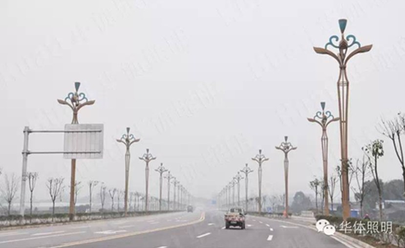 瓦屋山是古蜀著名的道教仙山,而在道教中蓮是修行者的象征,是翩翩君子的象征,因此本次景觀照明路燈選取了蓮花植物造型,并命名為金荷。2014年9月,由華體照明傾力打造的139盞金荷整齊的安裝在瓦屋山大道兩旁。金荷燈高15米,采用花瓣與燈臂的結合,燈具頂部“蓮蓬”生動形象,花紋流暢,將蓮花的婉約風姿展現(xiàn)得淋漓盡致;燈桿底座激光陽刻“綠海明珠,天府花園”字樣,底部融入水紋式樣,復古生動,似蓮生水中。