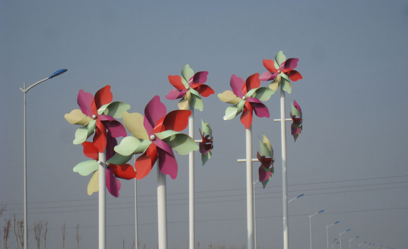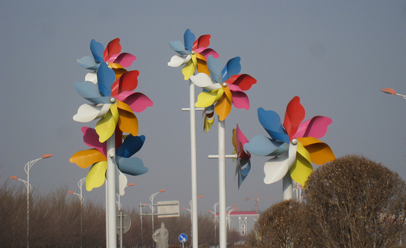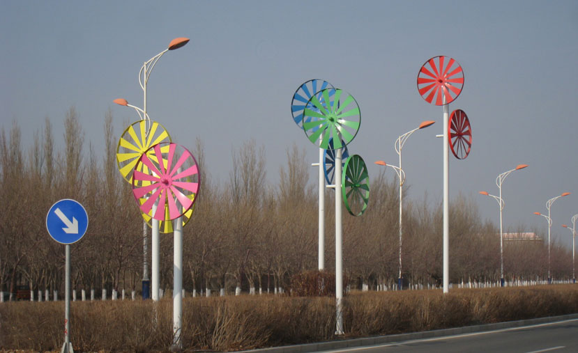 該景觀風(fēng)車由黃、綠、藍(lán)、紅、紫、灰等多彩顏色組成,風(fēng)車直徑為1.6米。每柱高度為4米至8米不等,由低到高分布,賦予時尚感。獨特的白色燈桿兩側(cè),由兩個風(fēng)車連接桿體兩側(cè),形成高低臂造型,對稱性強(qiáng),形成獨特的風(fēng)車景觀。
