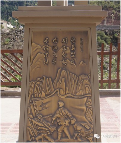 燈體底座采用了紅色文化設(shè)計元素,進行銅板雕刻紅軍抗戰(zhàn)形態(tài),燈底長城紋理表面更具歷史厚重感。整燈玉蘭花的植物造型呼應(yīng)該城生態(tài)化特征主題,為“景城一體”的目標出力。