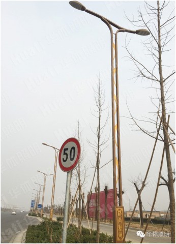 新區(qū)內工業(yè)大道及幸福大道運用的景觀路燈,曲線簡潔大方。燈頭采用華體專利“和諧”,工業(yè)感強,棕色桿體內鏤空的金黃色紋理活潑生動,底座加載文化元素—漢儀篆書繁體“渭南新區(qū)美麗經開”與“魅力新城 田園都市”字體垂直均勻分布于燈桿底座上。