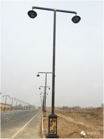 建設路,黑色桿體的景觀燈宏偉整齊的屹立在車道兩旁,矗立延伸,華麗而莊重。采用特殊工藝的自制燈頭,垂直于燈臂兩側,立體感強。單桿連接的底座,黑色金屬板鏤空雕花,代表渭南市花月季栩栩如生,傳遞地域文化。