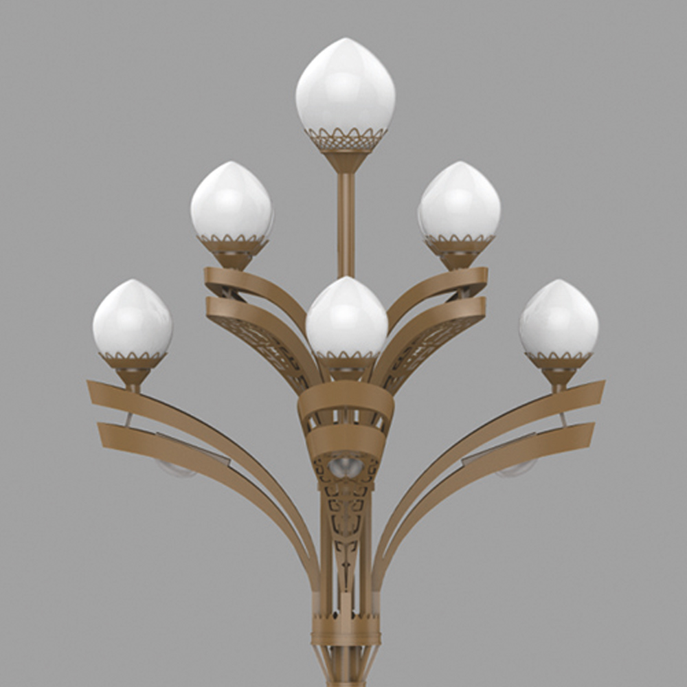 荔枝中華燈的設(shè)計(jì)是在玉蘭燈設(shè)計(jì)的基礎(chǔ)上運(yùn)用創(chuàng)新思維,將荔枝的形態(tài)作為元素,突破傳統(tǒng)觀念進(jìn)行設(shè)計(jì)與開發(fā)的一款新型多頭道路燈,在外觀上實(shí)現(xiàn)了厚重與輕秀、傳統(tǒng)與現(xiàn)代的完美結(jié)合,給人以華麗高貴之感;