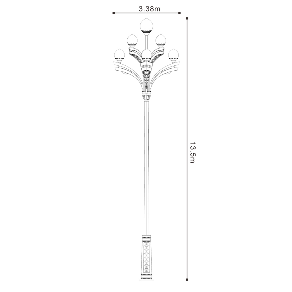 該燈可以將LED光源巧妙的配置于戶外文化定制燈具中,代替?zhèn)鹘y(tǒng)鈉燈及節(jié)能燈光源,使用革命性創(chuàng)新,在不影響使用及美觀的情況下,降低該類裝飾性景觀燈的功率密度,且在桿體內(nèi)側(cè)加裝華體單體智能照明管理系統(tǒng)。