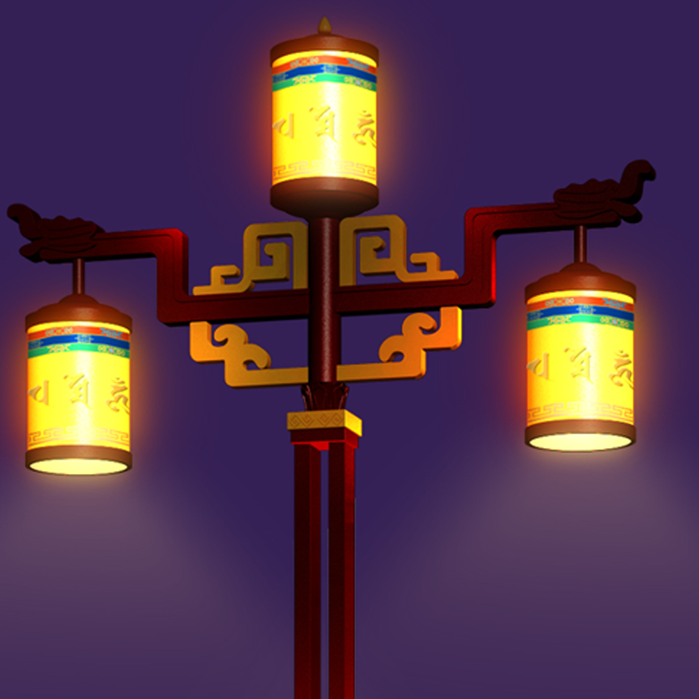 本款燈型具有典型的藏族韻味,藏紅色、藏金色的巧妙運(yùn)用,配合頂部轉(zhuǎn)金筒裝飾,讓燈具更具地域獨(dú)特性,底座鏤空藏傳佛教“蓮花”及壽紋圖案,使得燈具細(xì)節(jié)更豐富飽滿。