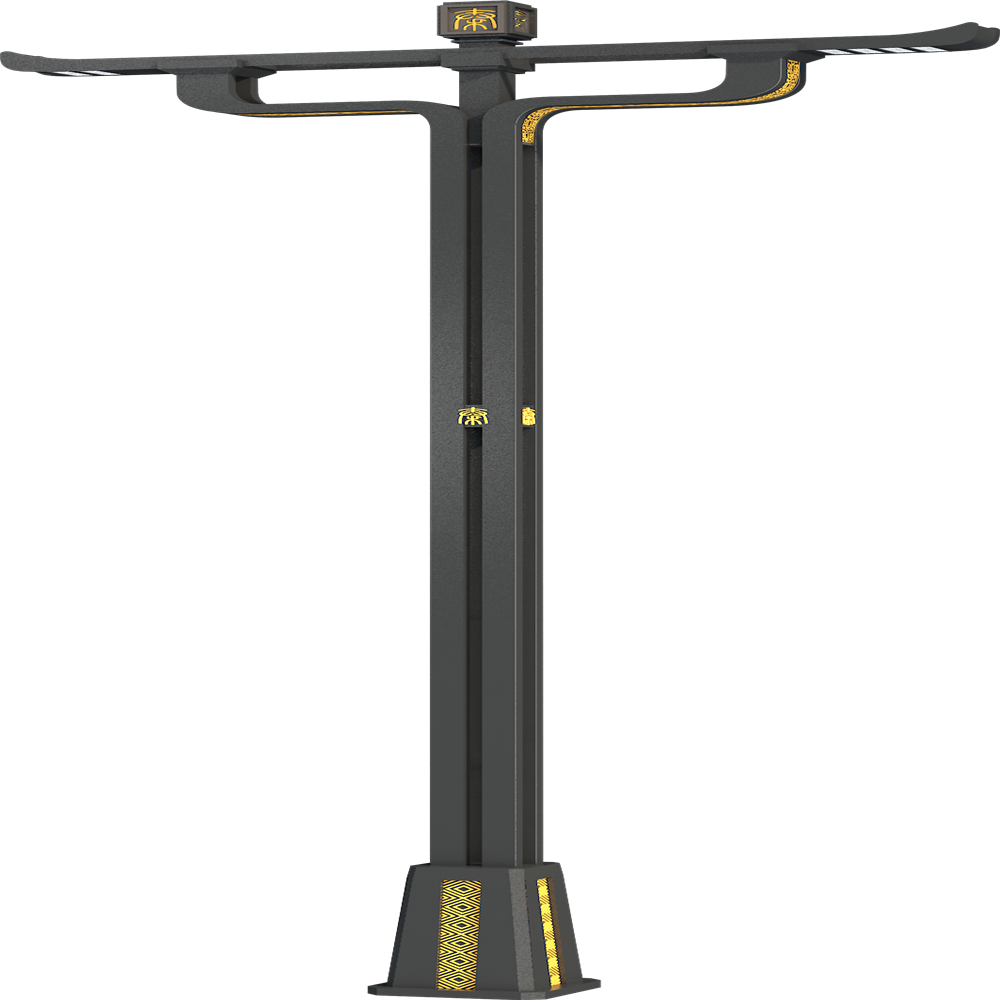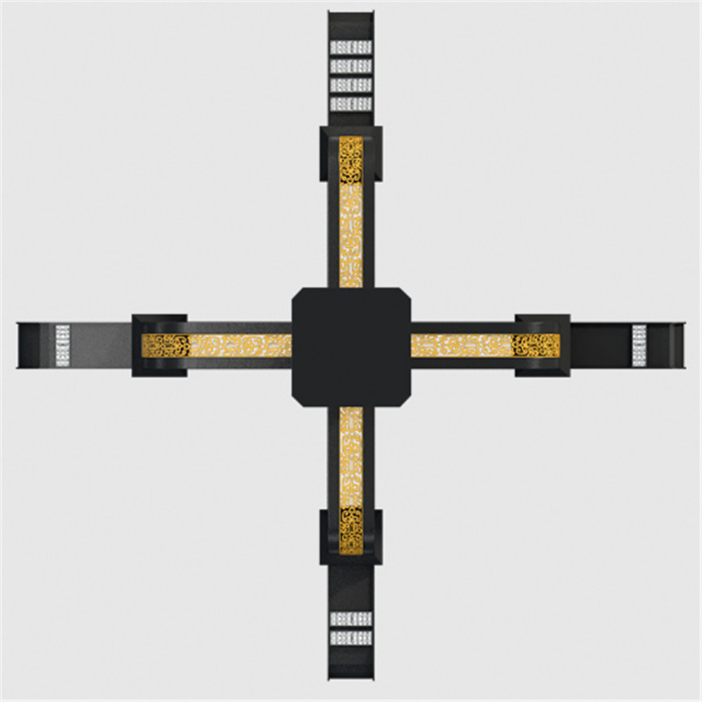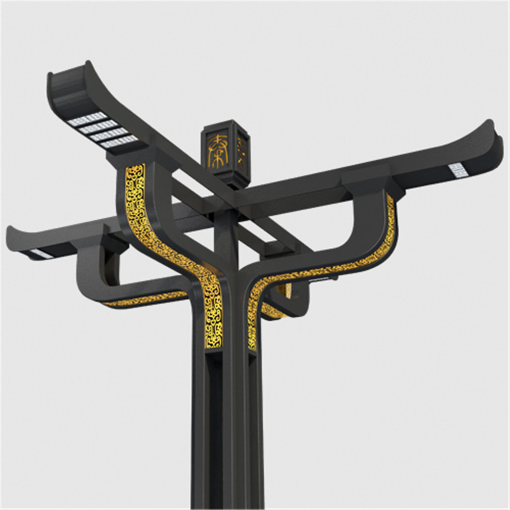 設(shè)計(jì)以秦漢建筑為元素,取秦代崇尚的黑色為主色調(diào),燈臂裝飾以秦代紋飾,造型則提取自漢斗、漢闕。線條流暢、簡(jiǎn)練,四向?qū)ΨQ的造型莊重大氣。