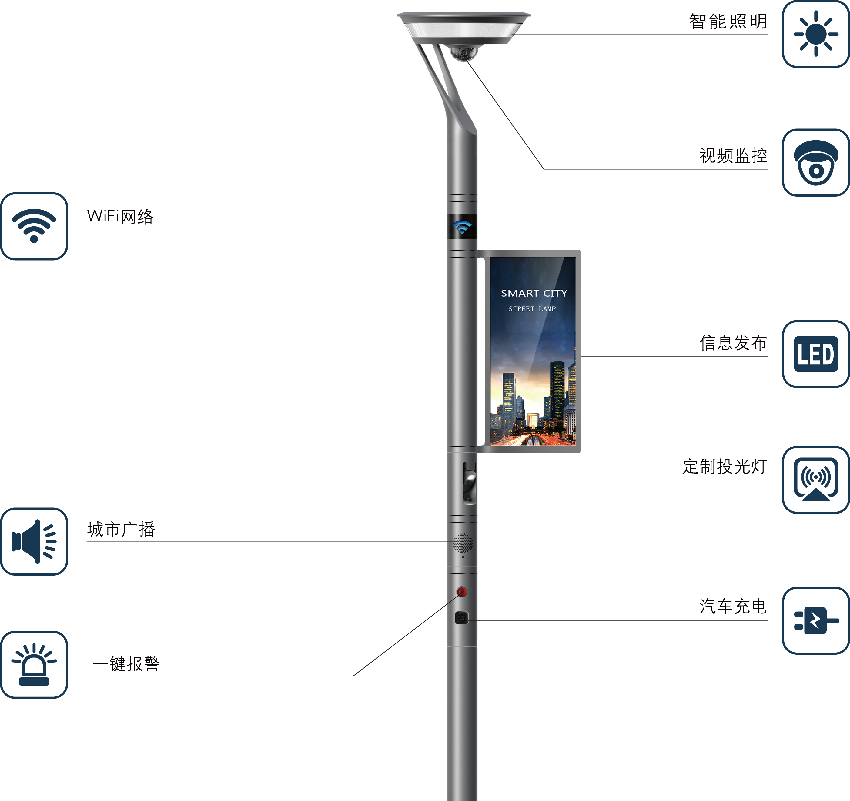 ·灯柱外形统一,可应用于智慧路灯功能的内嵌式集成安装、如检测功能、城市广播、移动网络覆盖、监控、LED展示屏、充电插口、一键报警等。具有国家专利。